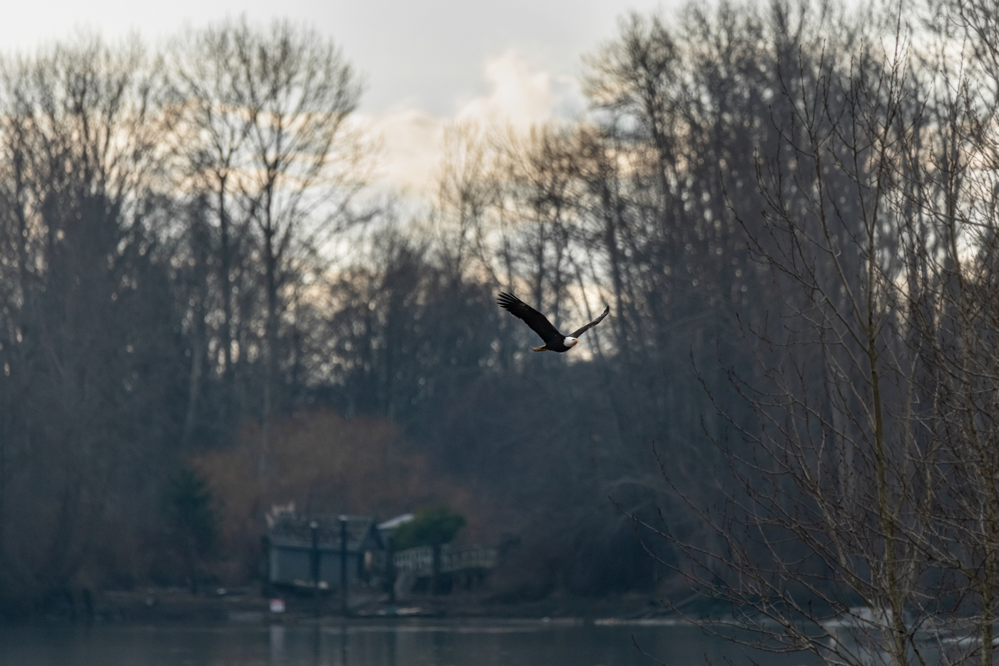 Bald Eagle flaying over the river