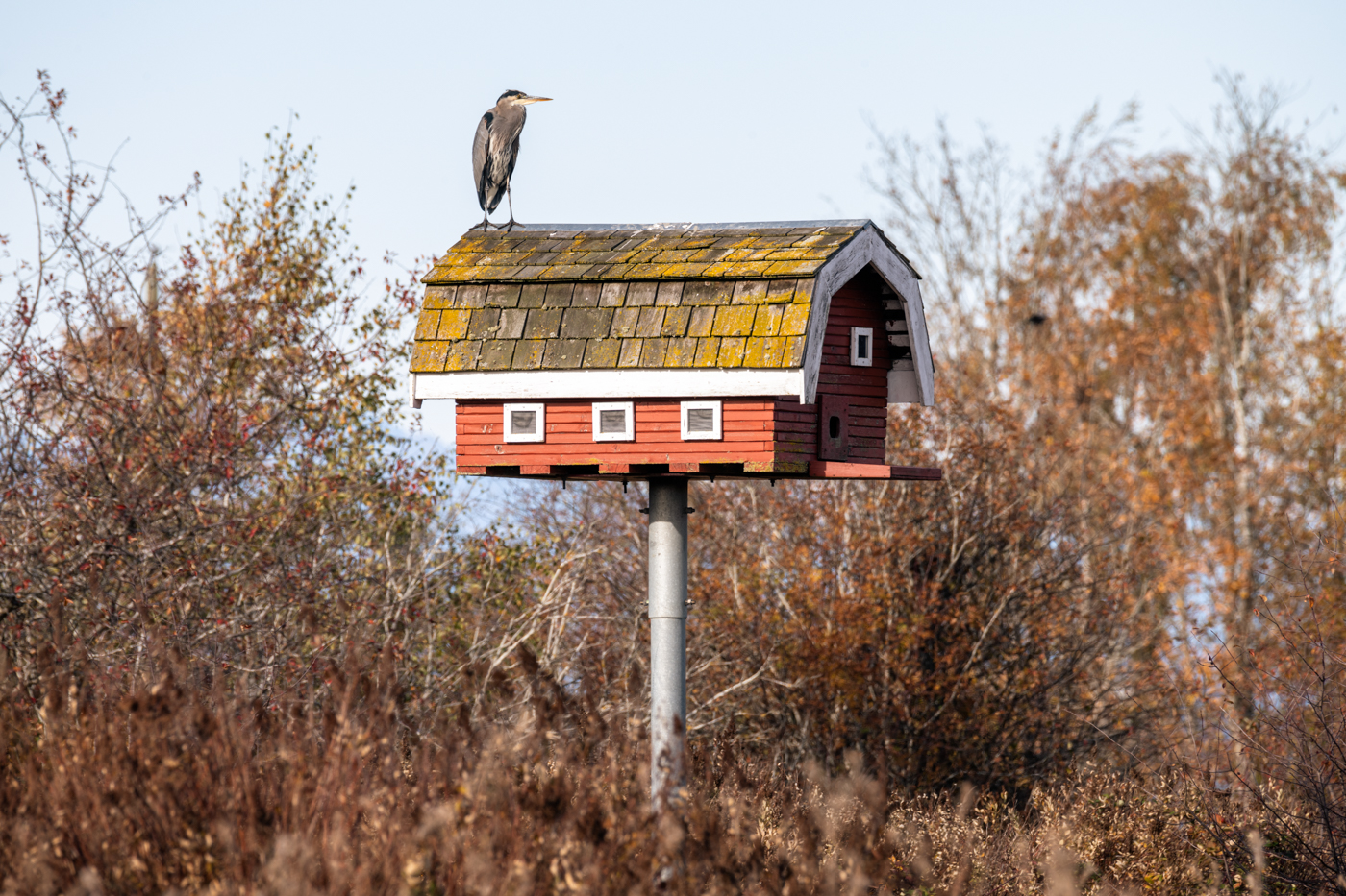 Blue Heron standing on a big bird house on the coast of British Columbia