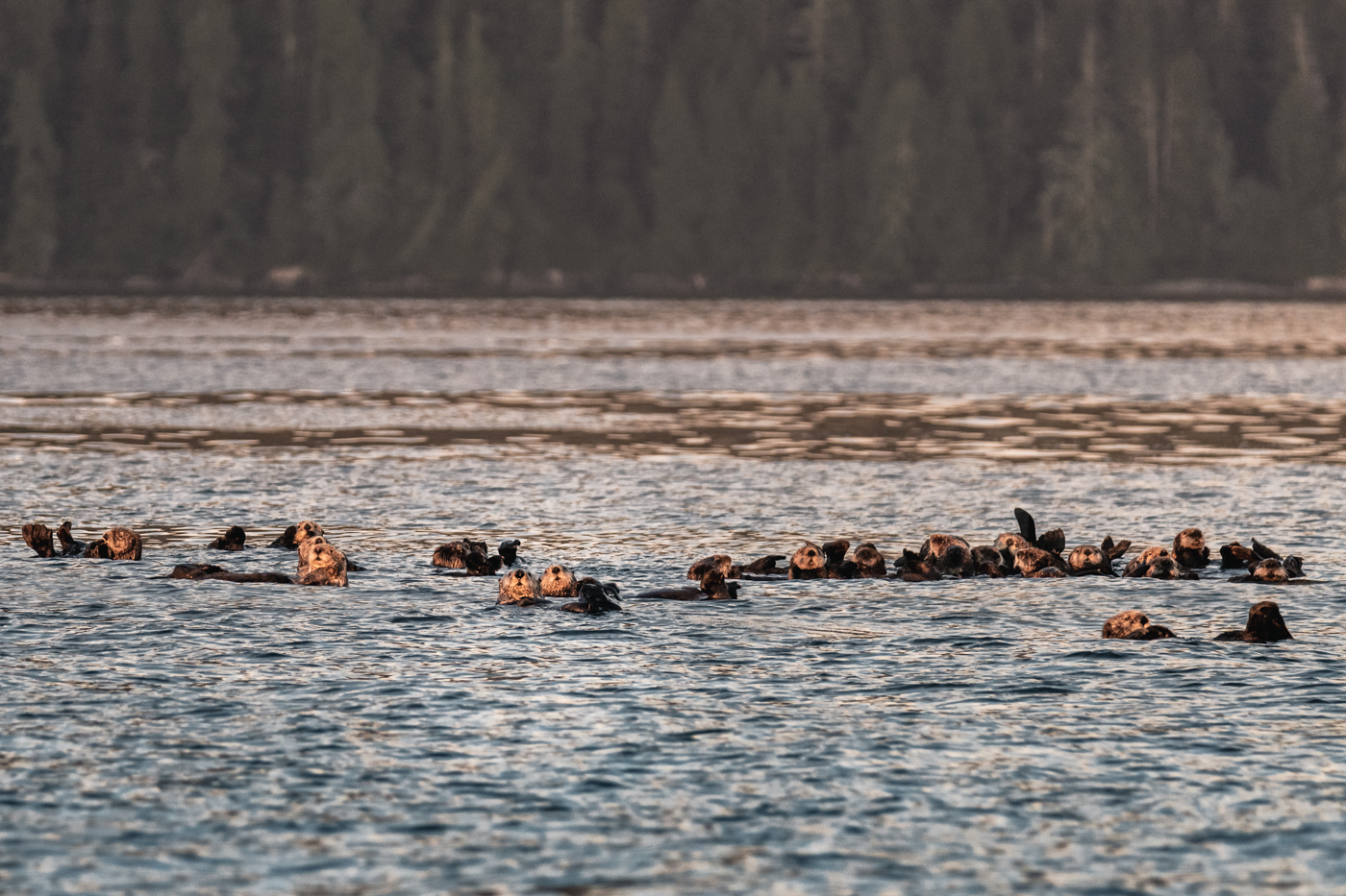 Raft of sea otter spotted near Tofino, enjoying the last glimpse of sunlight during sunset.