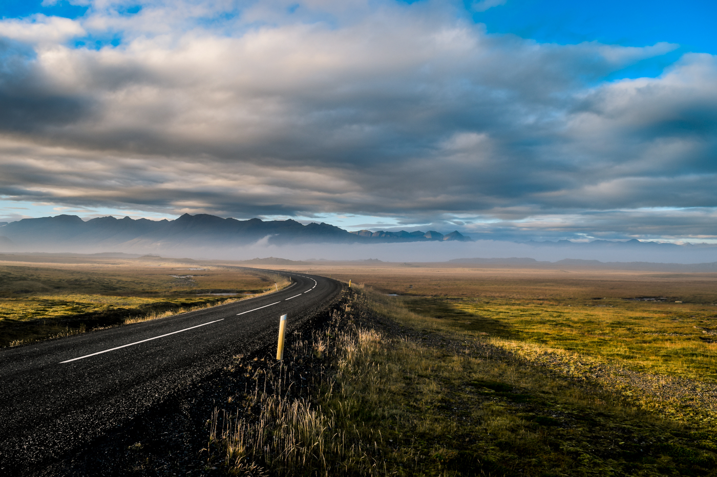 Little corner of road bending to the left in direction of the mountains, not far from Hofn on the south coast of Iceland.